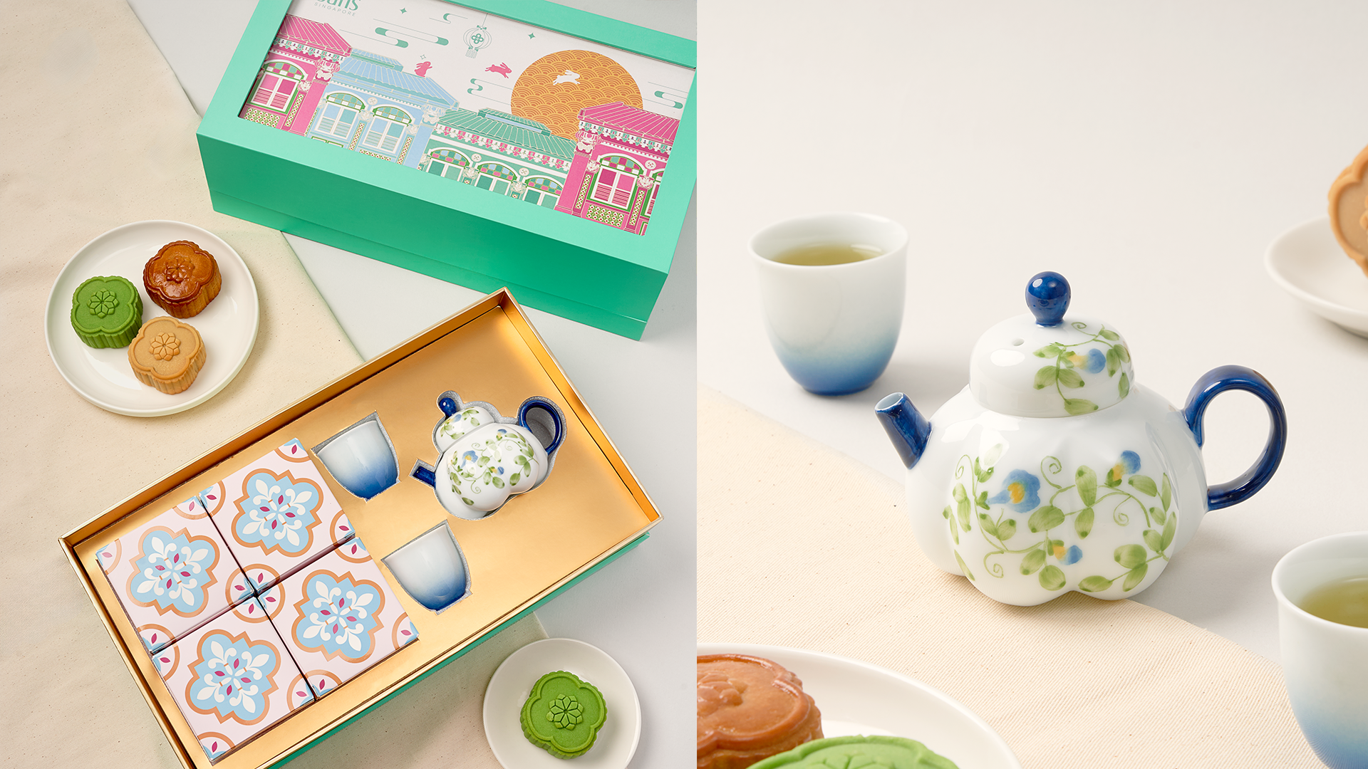 月饼 2 × 60克 迷你纯莲蓉瓜子金黄蛋黄月饼1 × 60克 迷你翡翠班兰莲蓉月饼1 × 60克 迷你黑芝麻花生酱月饼瓷器 1 × 手绘南瓜形茶壶饰以蝶豆花(115ml)2 × 手工喷绘茶杯(37ml)*由于每件作品均为手工绘制,与图片略有差异属正常现象。包装规格 18.5cm (高) x 33cm (长) x 10cm (宽)特别功能 内部插画卡片可更换(起订量:200)——这是一个贴心、简单却富有创意的触动,为定制增添灵活性,为整体呈现增添视觉趣味。